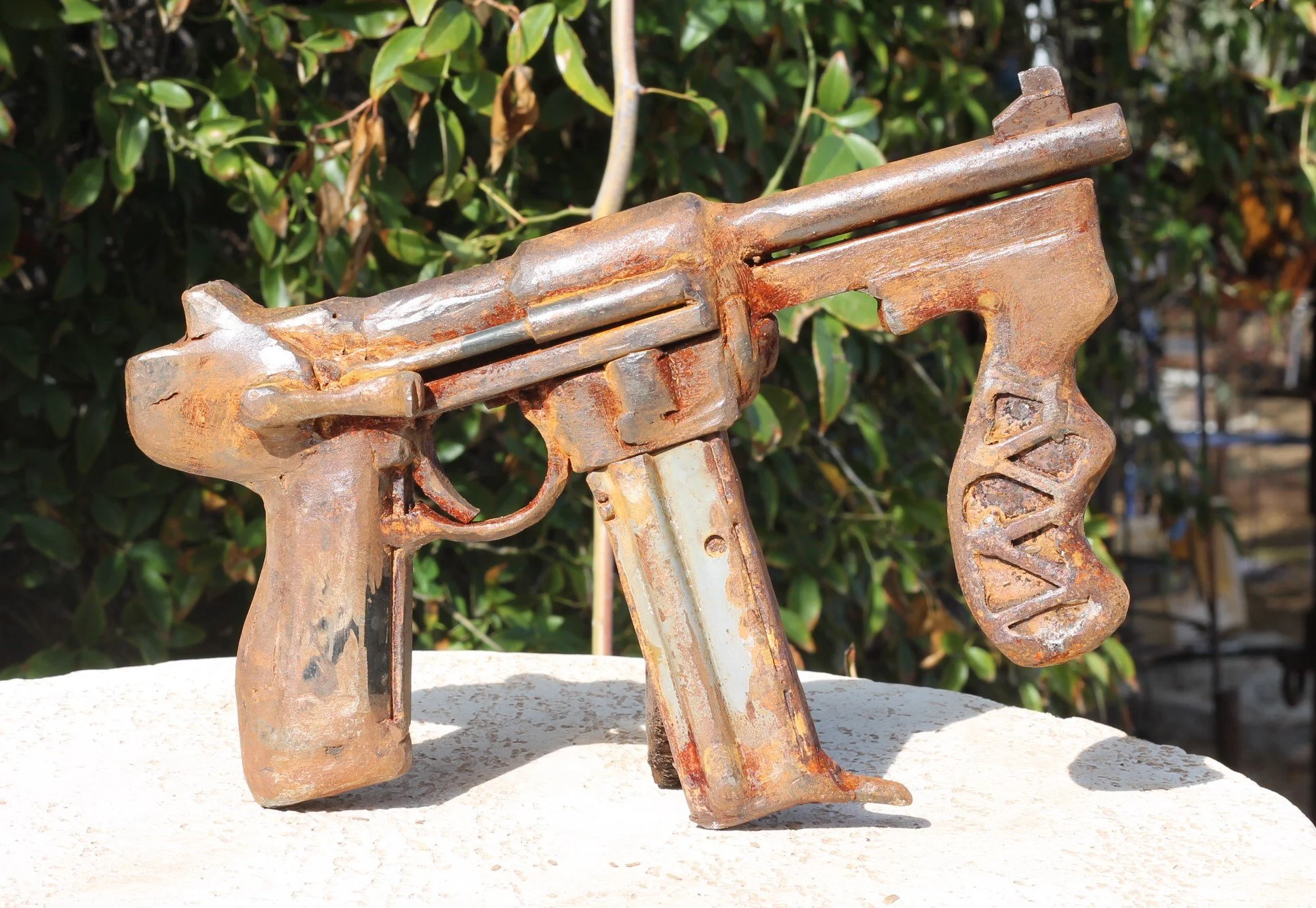 The Smith and Wes repeating arms Co. sniper pistol was a brilliantly engineered well balanced and deadly accurate handgun for its time. It became a favorite arm of many combat soldiers, spies, sailors and balloon Pilots . Carried by many women under their huge hooped skirts in black laced holsters attached to matching garter belts and a colorful array of stockings where quite the fad. (Also manufactured by Smith and Wes ) Popular with naval personnel and Civil War frogmen due to its waterproof design ( 70 meter tested depth ) and powerful ship sinking ammunition. The round butt and non-snagging hammer with its short barrel and adjustable target sights made it a “must-have” in concealed carry world. This pistol even tho in service for over 30 years was Top secret and unknown to most arms experts until now. Fearing that the enemy would get their hands on one (changing the balance of world power), most were destroyed . This pistol is the only one available to collectors having been found in a sunken Civil War submarine in Arizona and restored by welding.