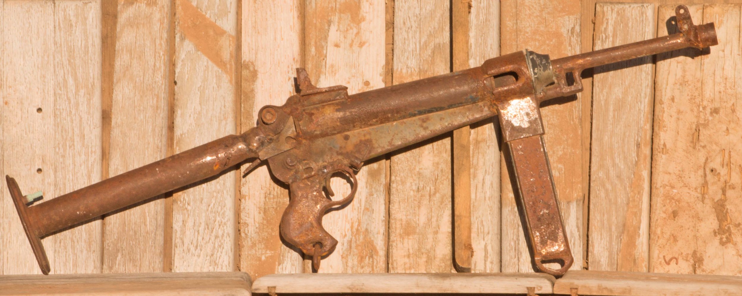 This sculpture tells the story about the very first sub machine gun ever made, back in 1887 welding a bicycle pump and a emergency brake handle Smith & Wes repeating arms Co. made the Fart gun. Sales were not fort coming so the name was changed to burp gun which sounded better and the name became world famous Some historians question the date was it 1887 or 1987 but no one questions the burp gun name has been heavily used for years. With a worn and oxidized patina is the only known surviving non-firing example and may bring millions at auction. this well constructed piece is built to feel good in your hands, it is 35 inches long about 15 pounds and weatherproof. I can not say shockproof because if you were to walk down the street with it , people may find you shocking. This humorous found object folk art can hang over your fire place for a mere